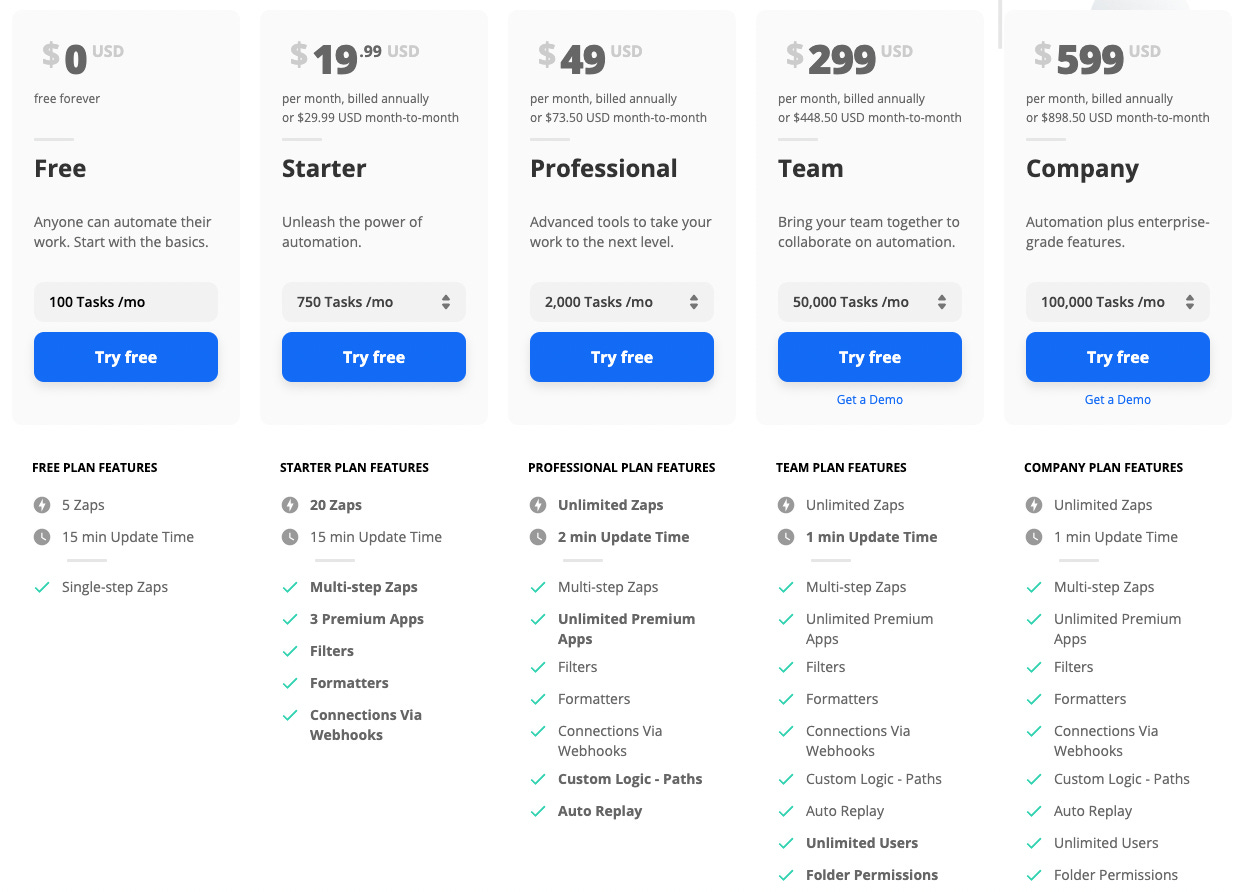 Zapier, on the other hand, started out supporting linear logic only and only recently rolled out Paths, which allows you to branch workflows based on a conditional logic. But not only is this functionality locked until you start paying $49/month, but you can apply conditional branching only to the last step in the workflow (i.e. no multi-branching)2.