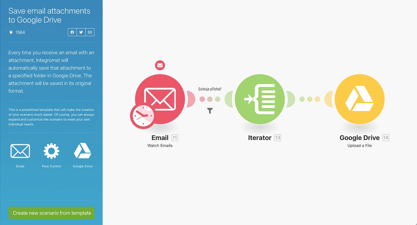 Let’s say that you regularly get lots of emails with attachments that you have to download and save. Perhaps it’s automatically generated invoices that you have to store in a folder, or maybe it’s PDF receipts that you have to file an expense report for at the end of every month. Instead of having to download each attachment individually, you can automate this task using Integromat.